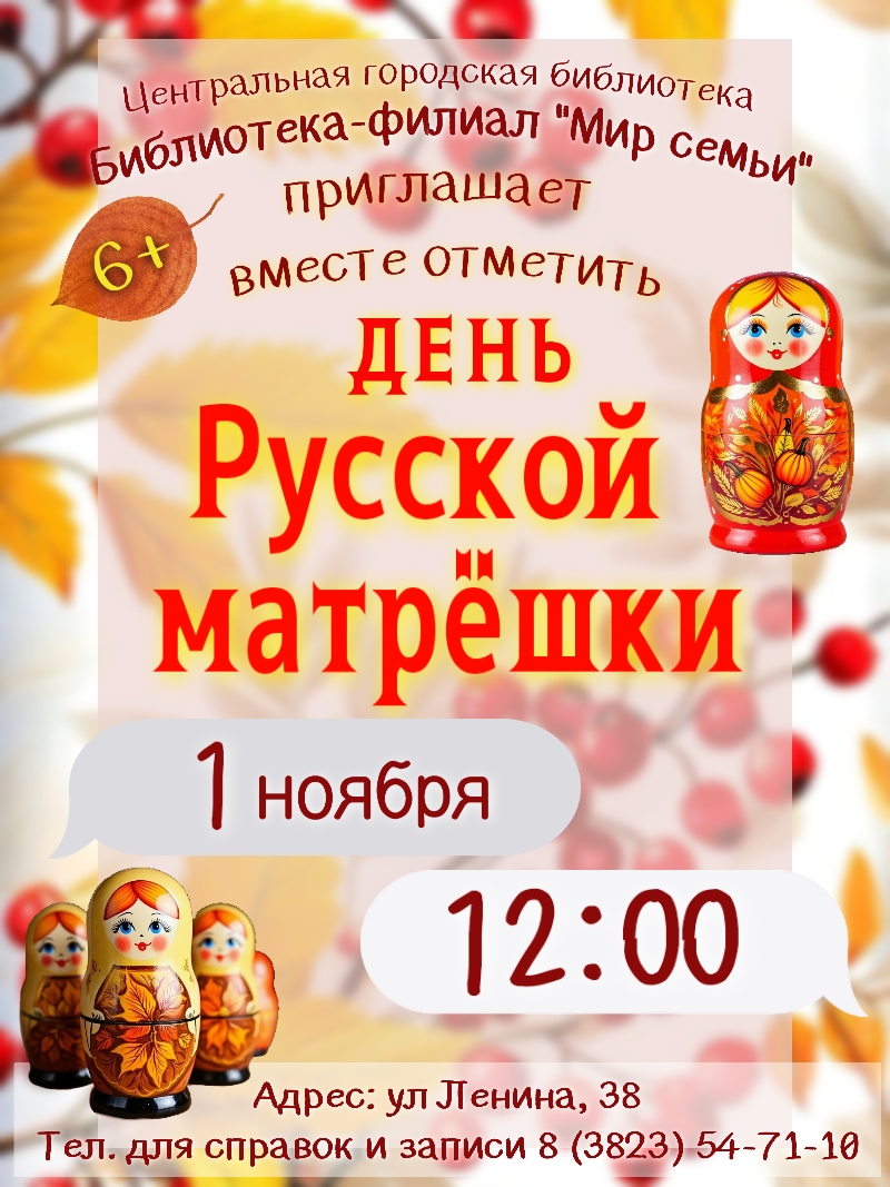 Друзья, приглашаем вас 1 ноября в 12:00 в библиотеку-филиал «Мир семьи» на наше уютное мероприятие, посвящённое знаменитой матрёшке – настоящему символу России.