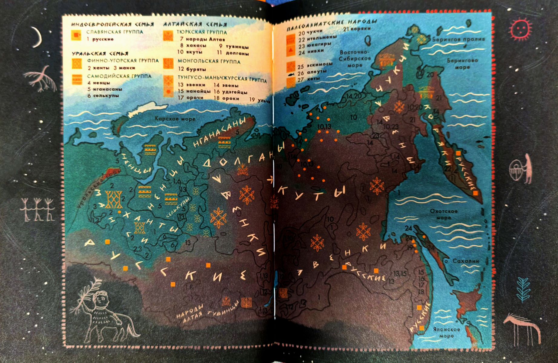 Книга компактная, но насыщенная. Удобно ложится в руки, не утомляя, идеальна для чтения. И вот вы уже не в кресле, а у шаманского костра, где боги плетут мир из перьев и снега. Структура продумана до мелочей: от введения в быт северян (полярная ночь, шаманские ритуалы, карты Сибири) к динамичным мифам. За ними следуют доступные разборы, список терминов и блок загадок с ответами. А отдельный раздел о шаманских традициях — это мостик от фольклора к истории, который заставит задуматься: как древние сказы живут в современном мире?