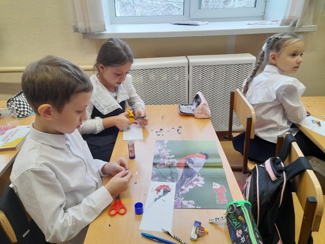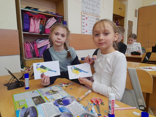 Завершилось мероприятие творческой частью. Ребята создали очаровательные поделки в форме синиц и украсили ими специальный плакат с изображением дерева, проявив фантазию сделали зимних птиц в необычной технике «обрывной аппликации». Завершающим аккордом стало проведение акции по развешиванию кормушек, сделанных своими руками. Насыпая корм, ребята произнесли приговорку: «Птичка, птичка, вот тебе крошки с моей ладошки».