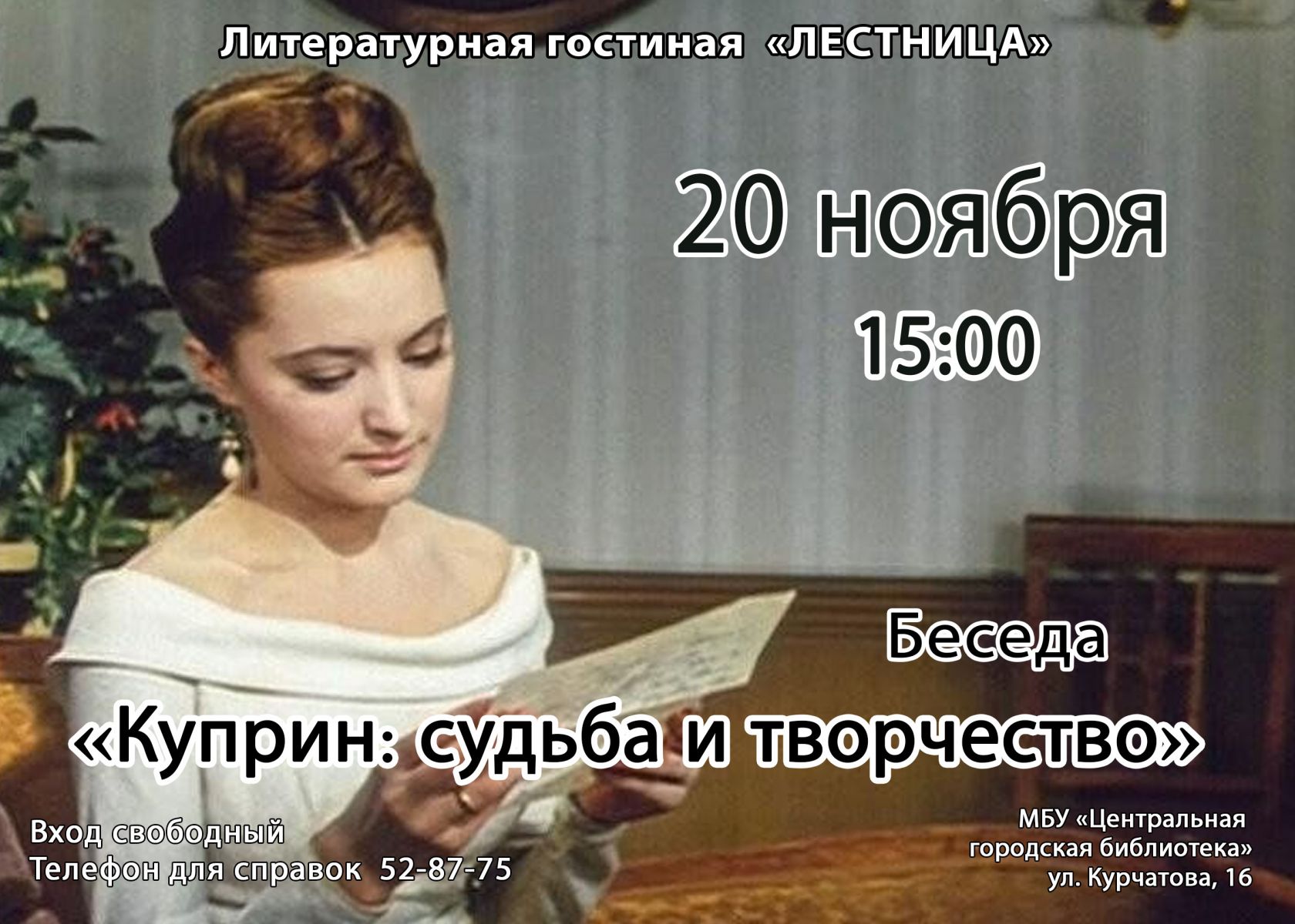 Литературная гостиная «Лестница» приглашает всех желающих на беседу «Куприн: судьба и творчество», которая состоится 20 ноября в 15:00 в Общественном музее С. Есенина Центральной городской библиотеки по адресу: ул. Курчатова, 16, 1-й этаж.