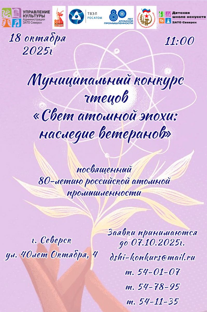 Дорогие друзья! Приглашаем вас принять участие в муниципальном конкурсе чтецов «Свет атомной эпохи: наследие ветеранов», посвященного 80-летию российской атомной промышленности.
