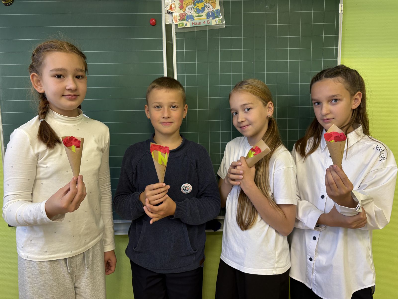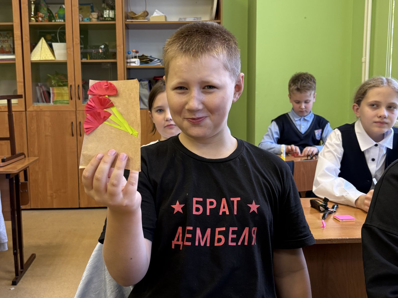 На этот раз ребята приняли участие в мастер-классе «Цветок Победы» и создали поделки из цветной и крафтовой бумаги.
