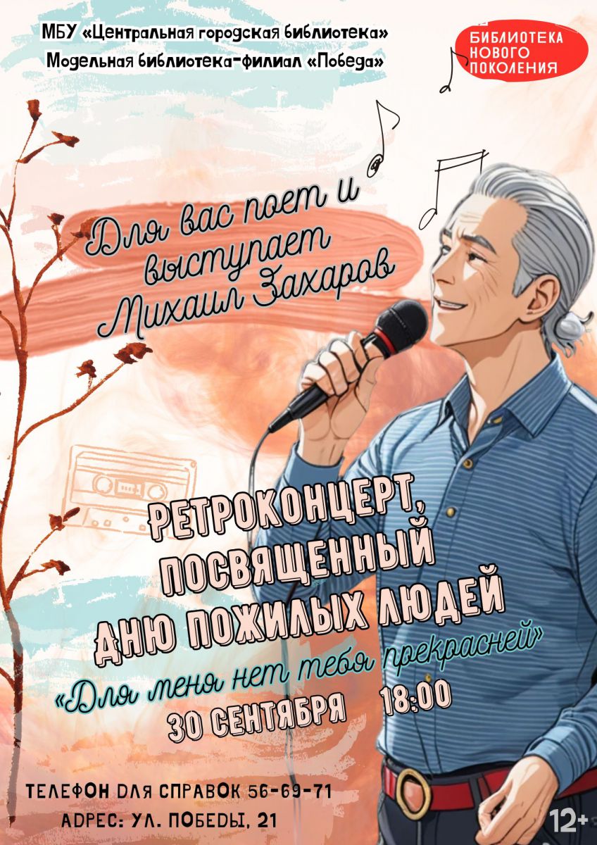 Дорогие друзья! В модельной библиотеке-филиале «Победа» состоится ретроконцерт, посвященный Международному дню пожилых людей «Для меня нет тебя прекрасней».