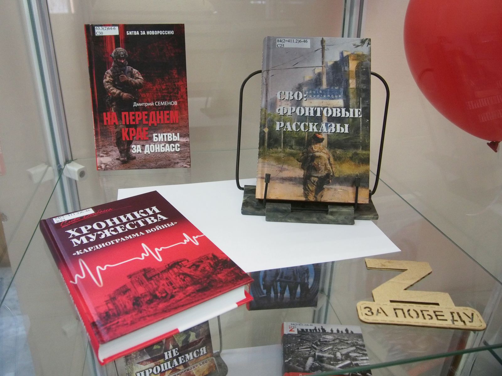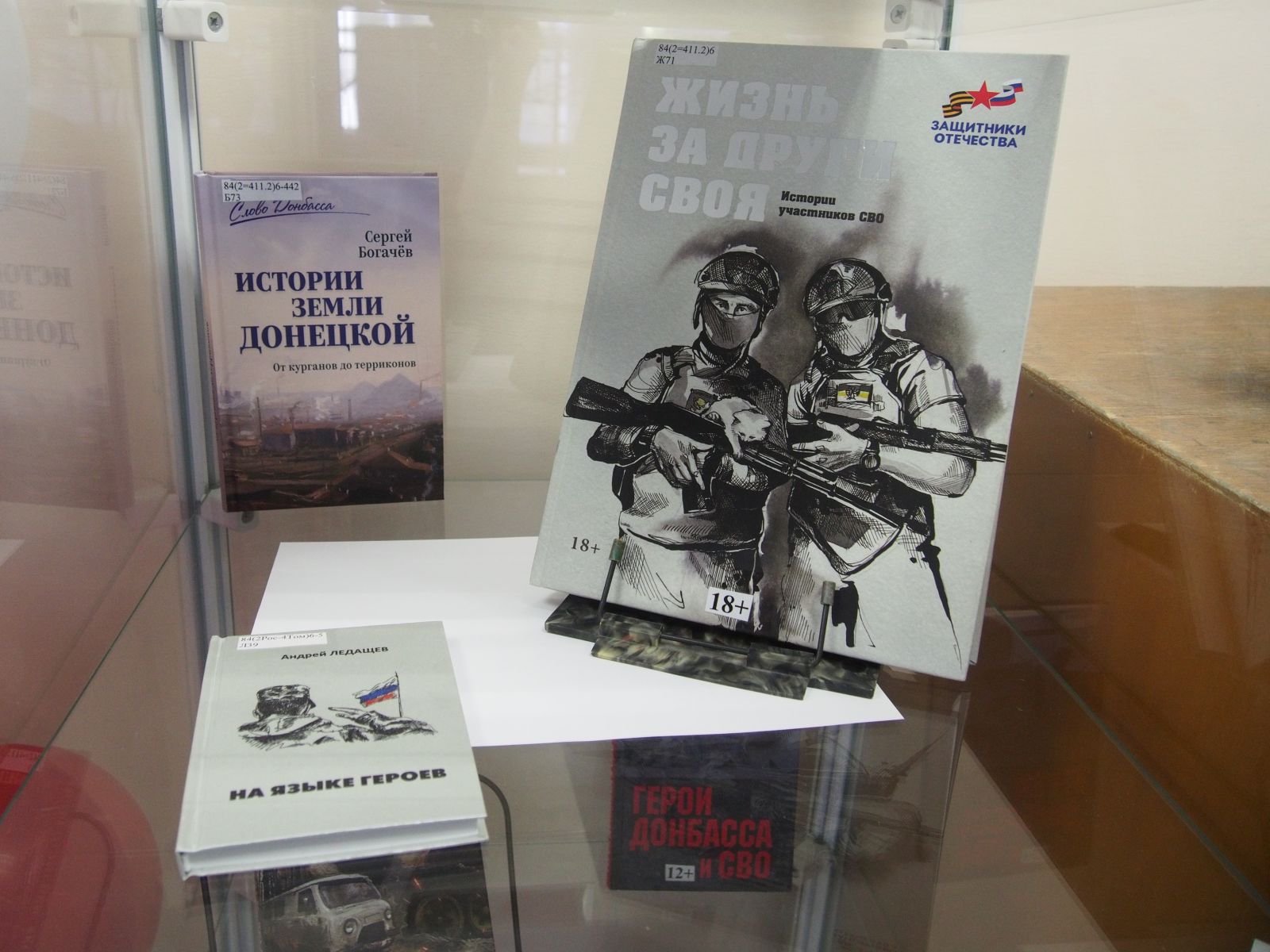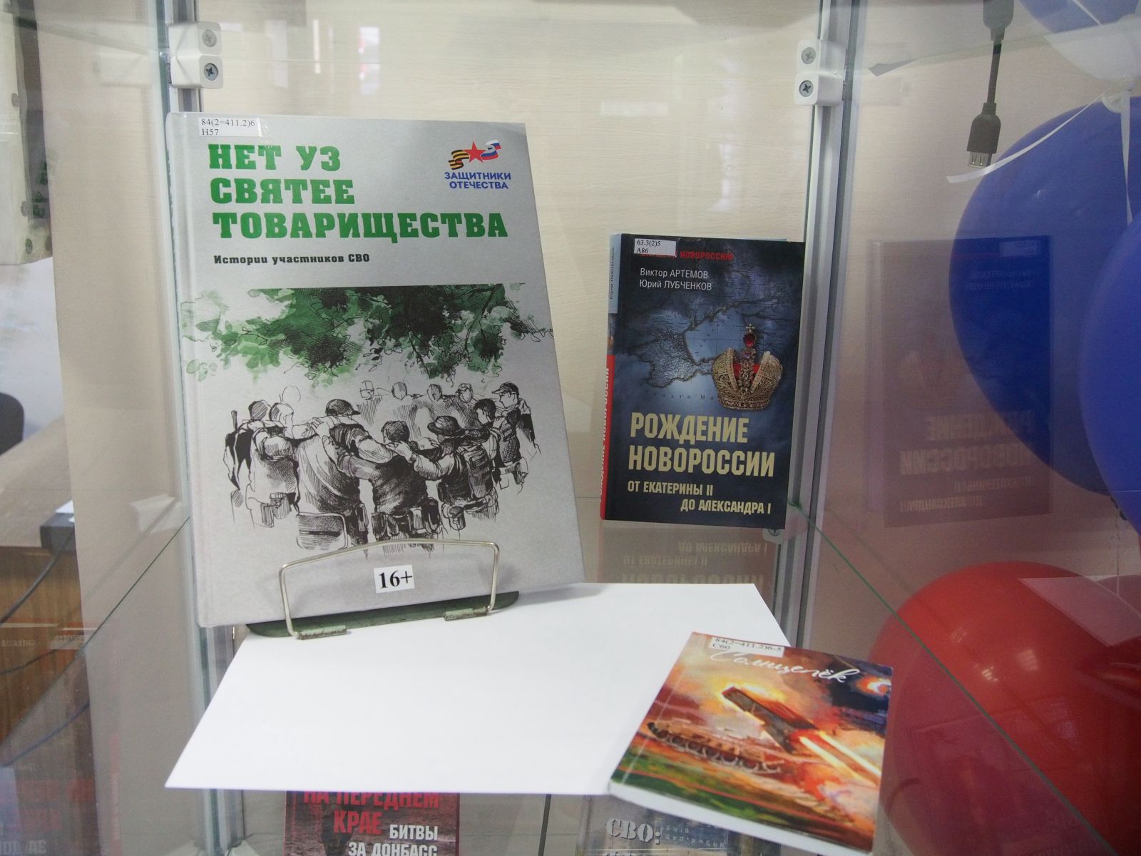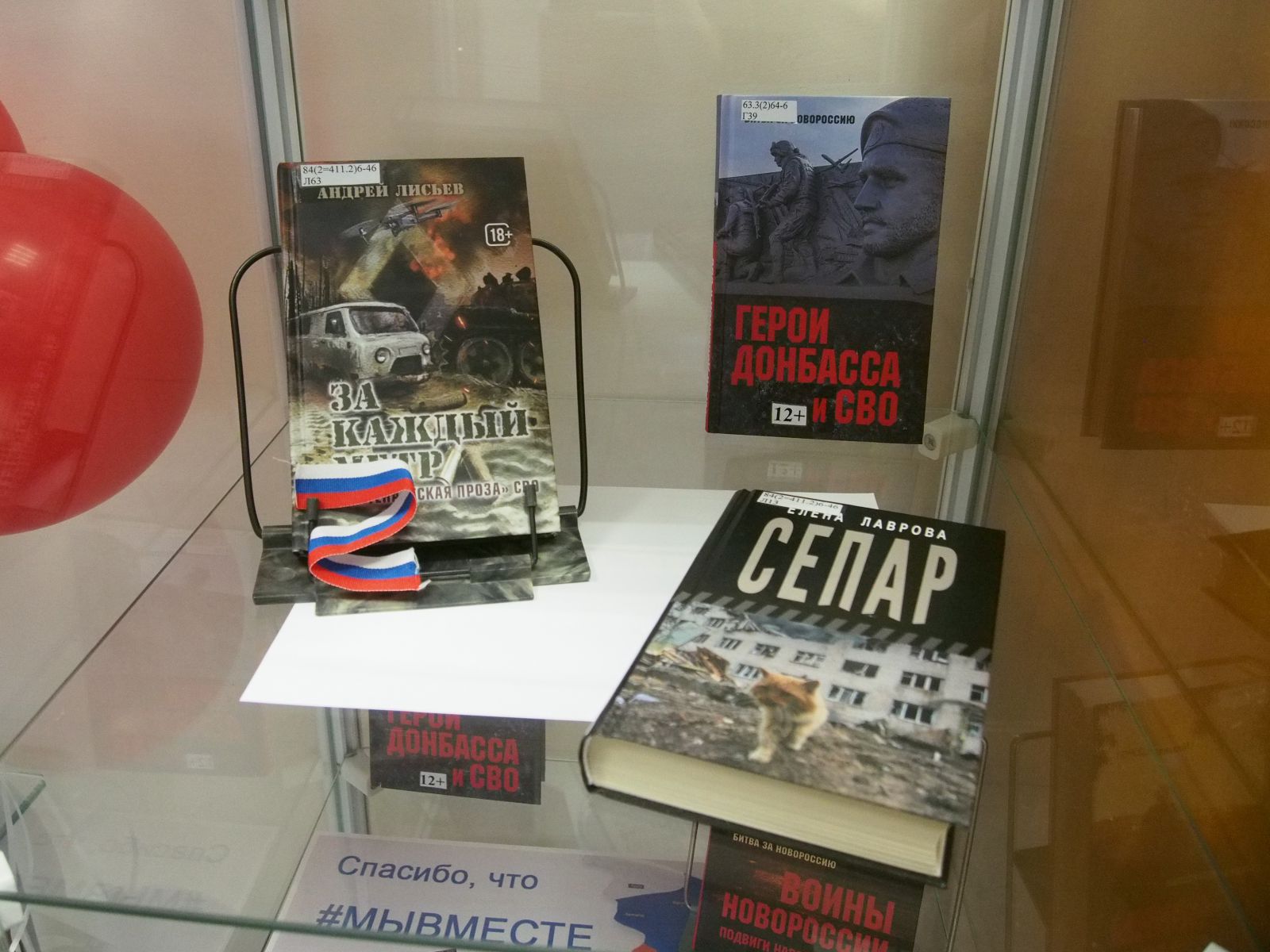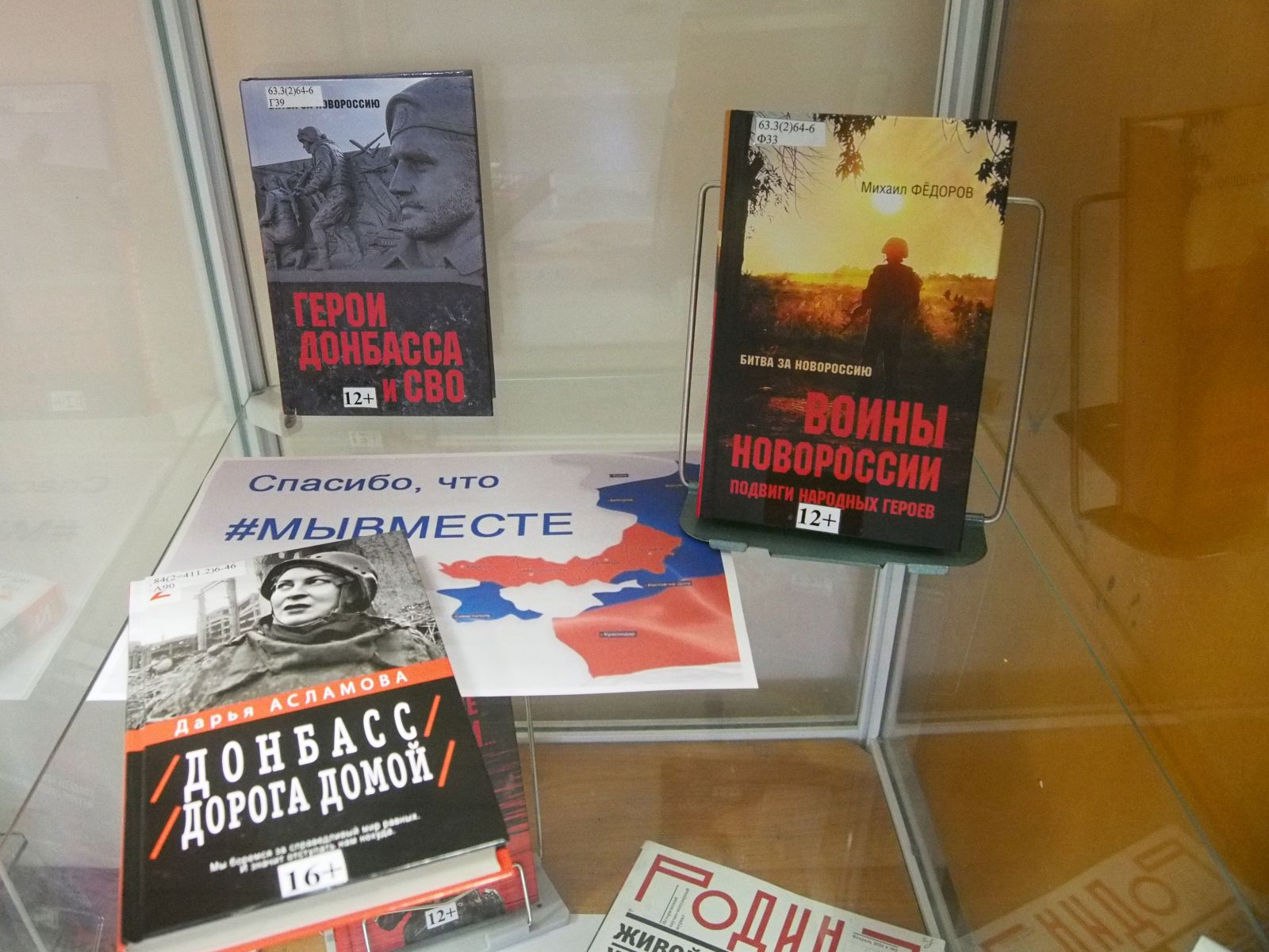 К трехлетию вхождения новых регионов в состав России в Центральной городской библиотеке (ул. Курчатова, 16) оформлена книжно-иллюстративная выставка «Одна страна. Одна Россия», на которой представлены воспоминания участников специальной военной операции, а также проза и поэзия, посвященные Донбассу.